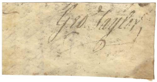 Signature of Declaration of Independence signer George Taylor cut from a document. A member of the first Contential Congress, Taylor's autograph is considered extremely scarce and has recently auctioned for over $8,000. The 2.5'' x 1.25'' slip of paper is signed ''Geo. Taylor'' with writing, not penned by Taylor, on verso. Soiled, otherwise in very good condition.