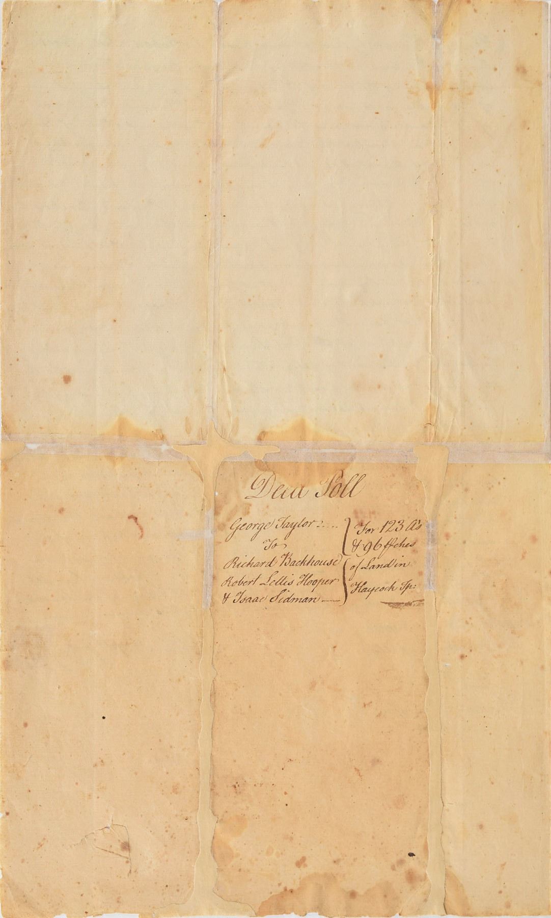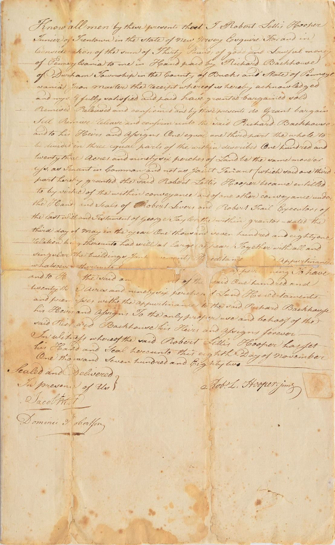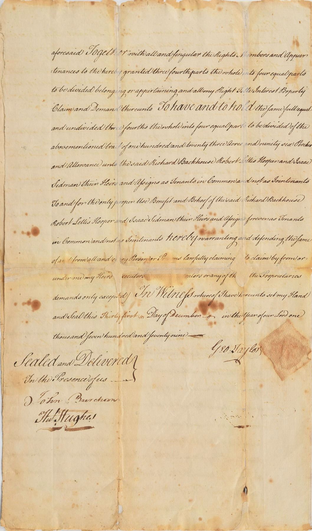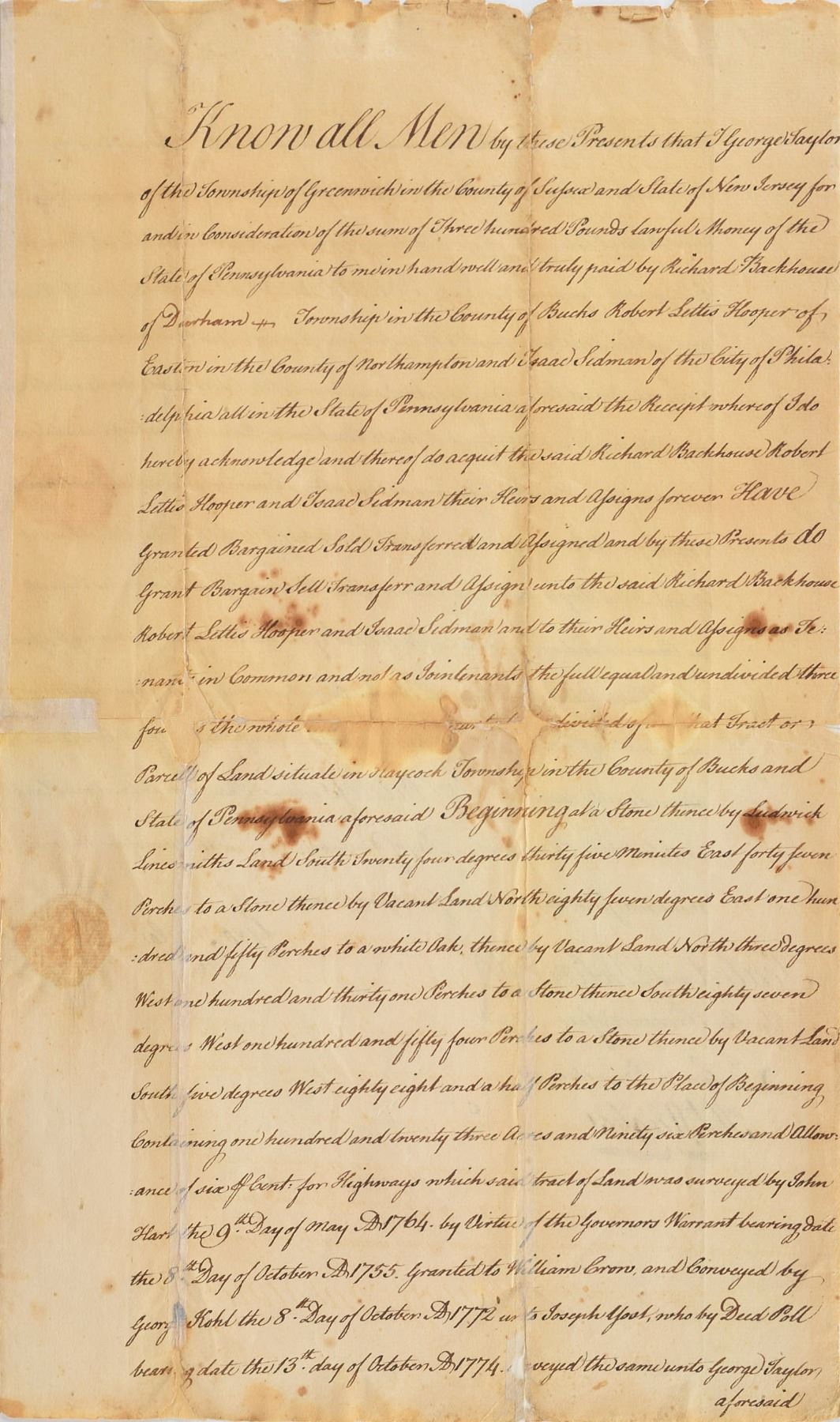 Signer of the Declaration of Independence from Pennsylvania (1716–1781). Rare Revolutionary War–dated manuscript DS, signed “Geo. Taylor,” one page, 9.25 x 15.25, December 31, 1779. Document concerning the sale of real estate, in part: "Know all Men by these Presents that I George Taylor of the Township of Greenwhich in the County of Sussex and State of New Jersey for and in Consideration of the sum of Three hundred Pounds lawful Money of the State of Pennsylvania to me in hand…forever Have Granted…the full equal and undivded…Parcel of Land situate in Haycock Township in the County of Bucks and State of Pennsylvania." Boldly signed at the conclusion by Taylor beside an affixed paper seal. The adjoining page bears a document signed by Robert L. Hooper, one of the parties to the original transaction, dated November 8, 1782, transferring his share of the parcel. In very good condition, with scattered staining, and separations and paper loss along intersecting folds showing both antique and recent repairs. Taylor ranks among the rarest Declaration signers, due in part to his limited role in public life, and his death prior to American victory in the Revolutionary War.