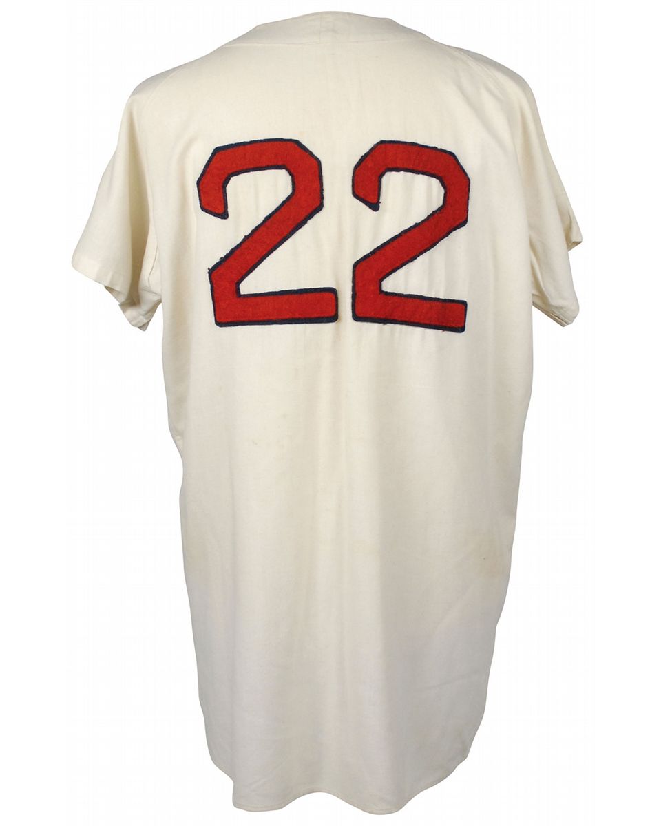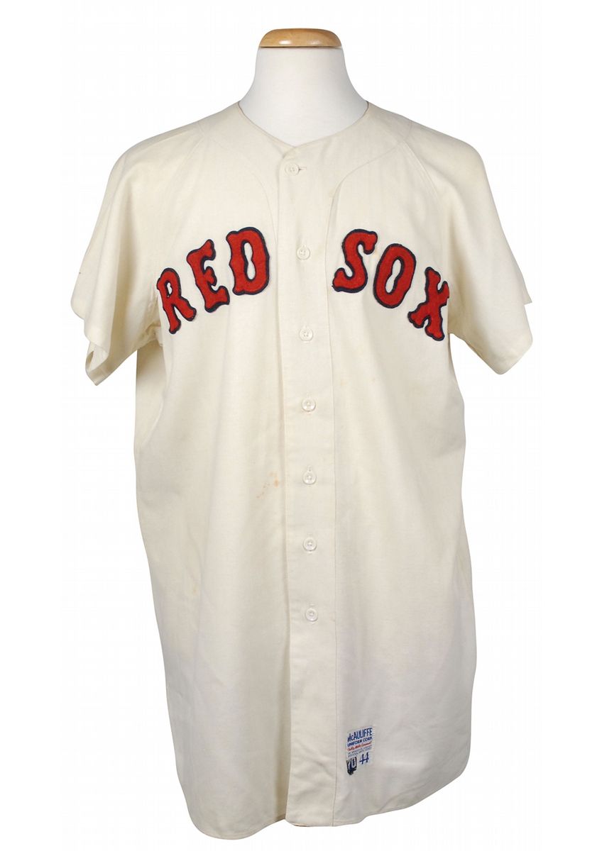 Thomas’s game-used Boston Red Sox home jersey from the 1970 season, with sewn on letters and numbers, featuring “Red Sox” across the chest and his number 22 on the back. The McAuliffe Uniform Corp. manufactuer’s tag is sewn to the lower right front tail, with smaller tags to indicate the size, “44,” and year, “70.” Exhibits light general wear consistent with use and some scattered staining to the front and back, otherwise fine condition.