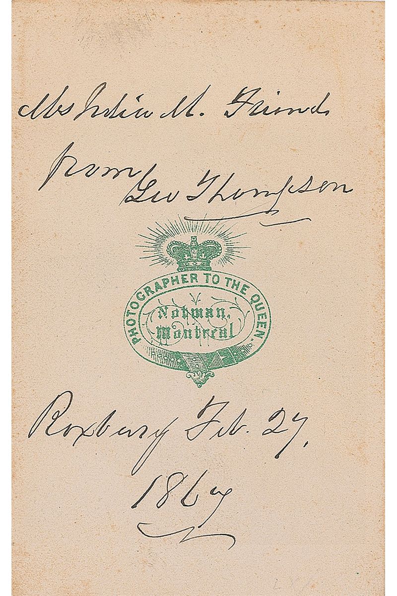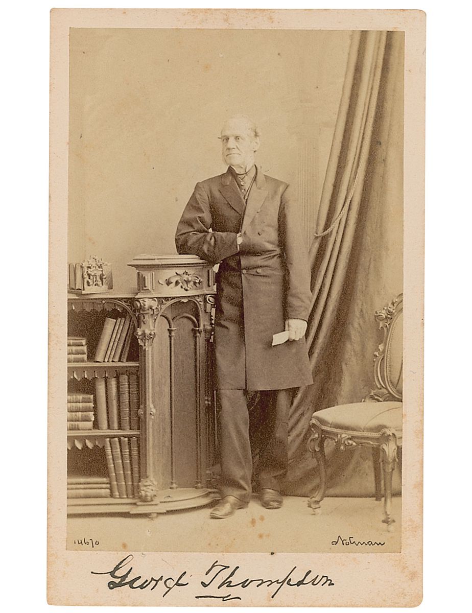 British antislavery orator and activist; arguably one of the most important abolitionists and human rights lecturers in the United Kingdom and the United States (1804–1878). Original 2.5 x 4 carte-de-visite portrait by Notman of Montreal, signed in the lower border in black ink, and signed and inscribed on the reverse, “Mrs. Julia M. Friend, from Geo. Thompson, Roxbury, Feb. 27, 1867.” In fine condition, with light scattered foxing.