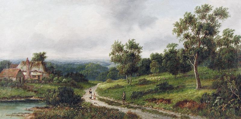 British [19th/20th century] BRINGING HOME THE FLOCK ON A COUNTRY ROAD oil on canvas (2) each 12 x 24 in. (30.5 x 61 cm) each signed Lot of Two