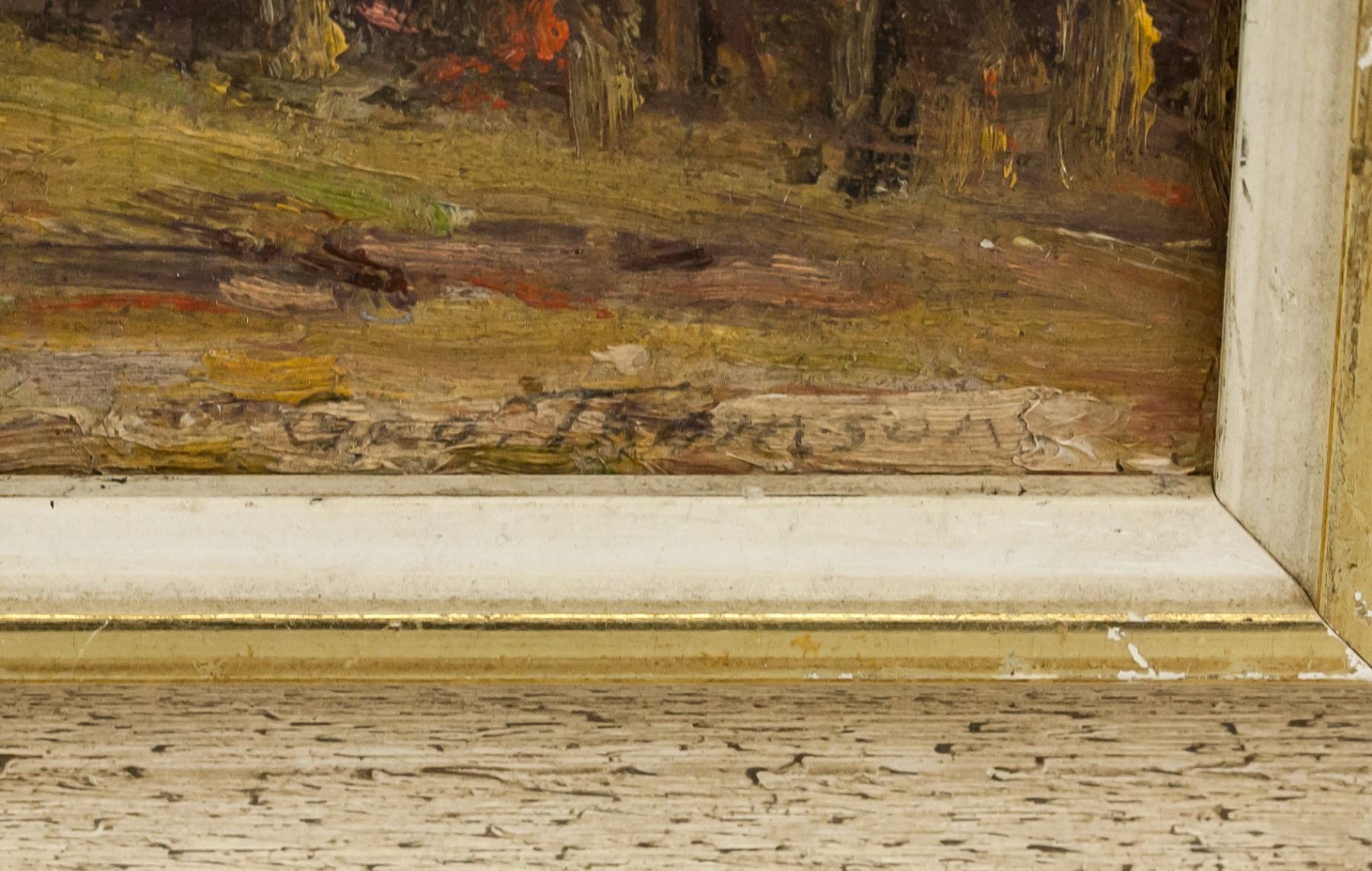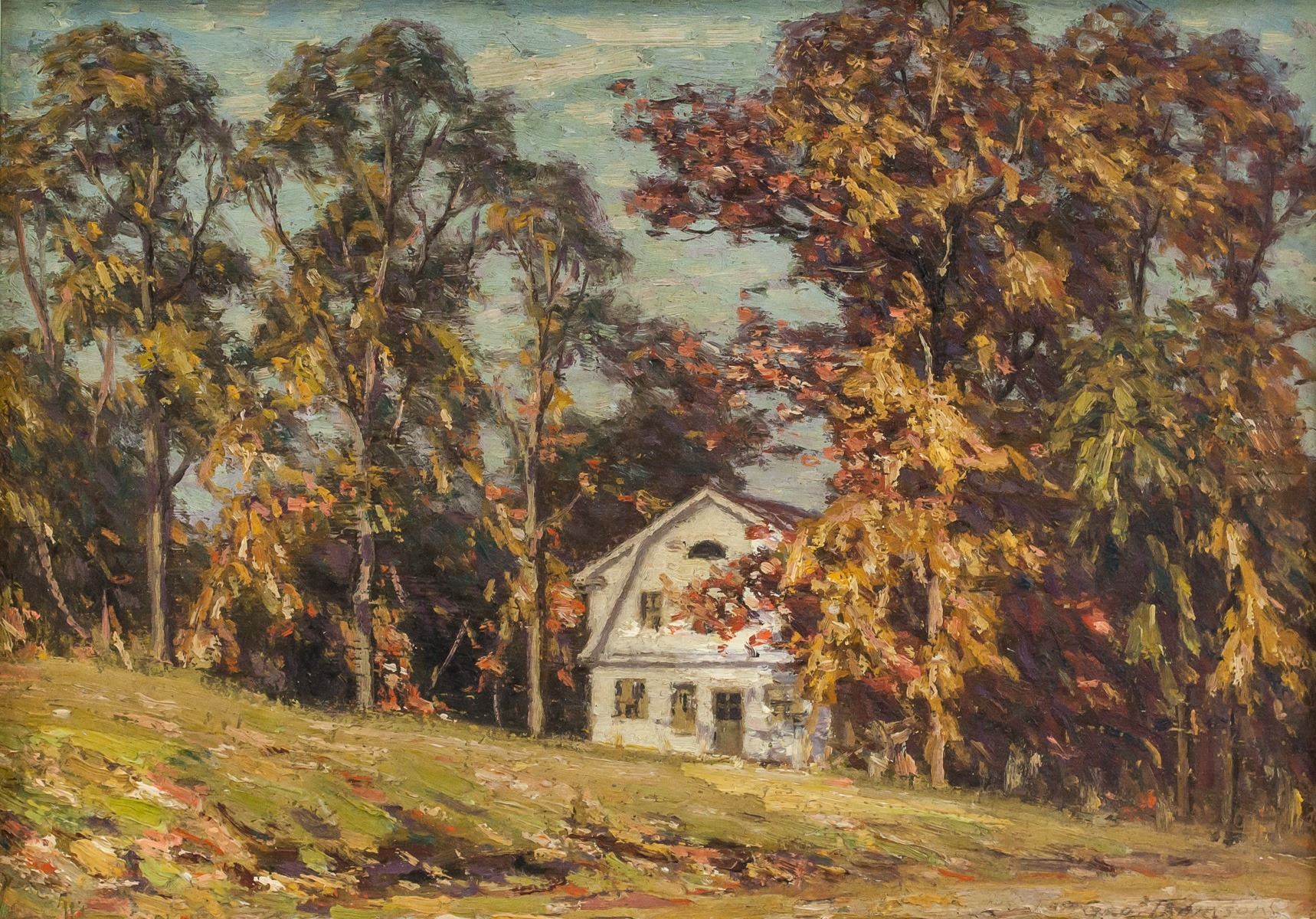 Oil on board and framed. Featuring house in the woods. Signed G. Thomson in bottom right corner. Inscribed with "25" on verso. Attributed to George Thomson (1868 - 1965, Canadian). 24 x 34 cm (9.5 x 13 in), Frame: 35 x 44 cm (13.8 x 17.3 in). PROVENANCE: This lot carries limited provenance from a Private Toronto collection