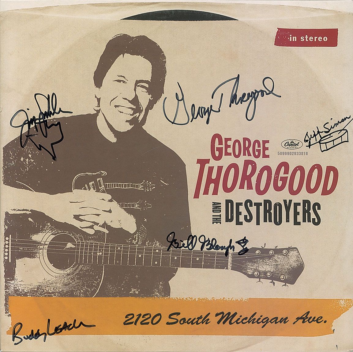 2120 South Michigan Ave. album signed on the front cover in black felt tip by George Thorogood, Bill Blough, Buddy Leach, Jeff Simon, adding a sketch of a snare drum and sticks, and Jim Suhler. In fine condition. The record is included.