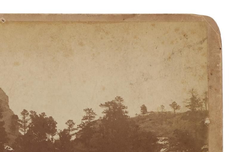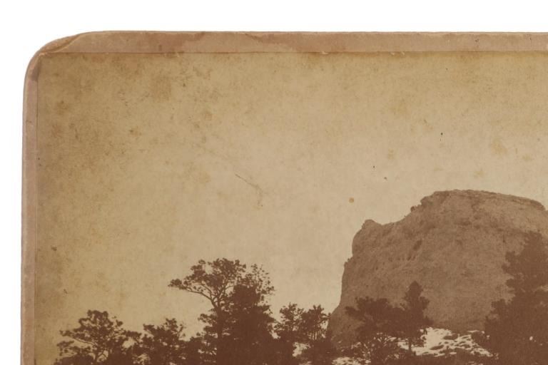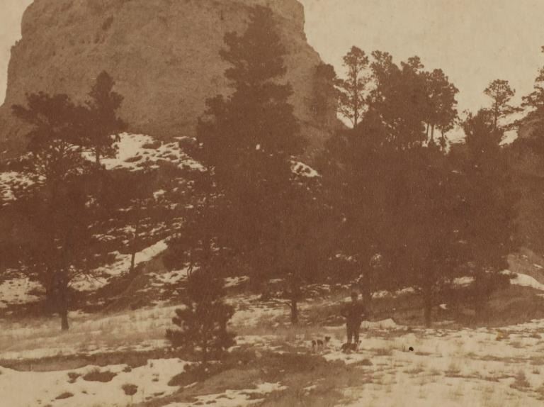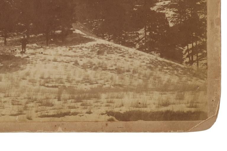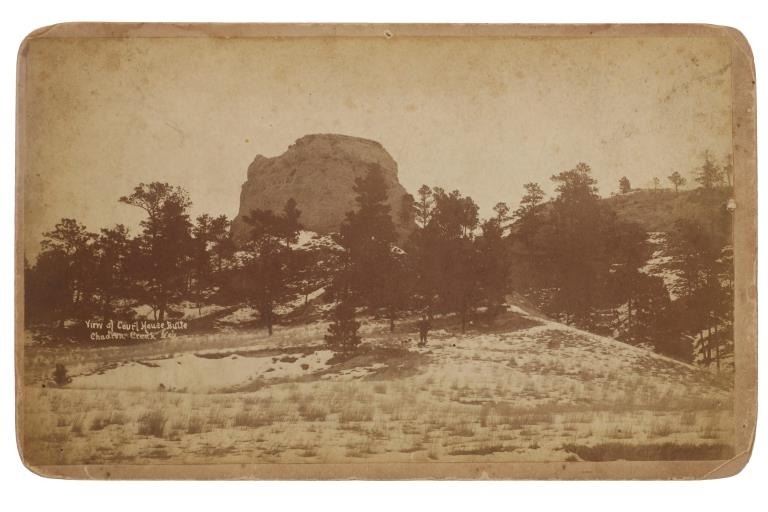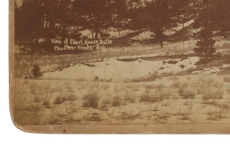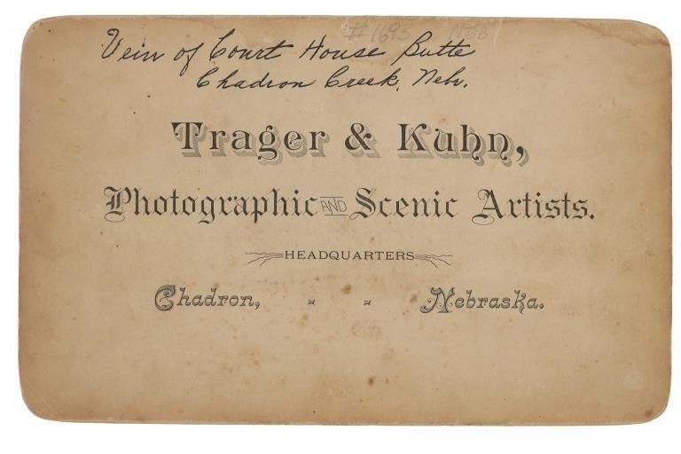 This is an original albumen photograph of Court House Butte Chadron Creek, Nebraska done in the late 19th Century by Trager & Kuhn Chadron, Nebraska. George E. Trager (1861-1948) was born in Germany in 1861 and arrived in America in 1876. He started his first photography in 1888 with Frederick Kuhn in Mazomanie, Wisconsin. The next year, 1889, they moved to Chadron, Nebraska and purchased the Bon Ton Art Gallery from Alice Luce. George Trager was the first photographer at the Wounded Knee Massacre. This piece is marked in the negative, “View of Court House Butte Chadron Creek Neb.” showing the beautiful Butte on a large format photograph on a boudoir card. The back is marked as Trager & Kuhn, Photographic and Scenic Artists Chadron, Nebraska and written on, “View of Court House Butte Chadron Creek, Neb. / #1693 NEB”. Provenance: From the Jim Aplan Piedmont, South Dakota collection. Measures 8.5” x 5.25”. Image is beautiful, some wear, corners worn on card, small hole at the top, but overall fair. U6