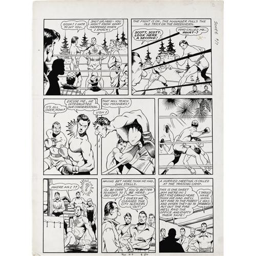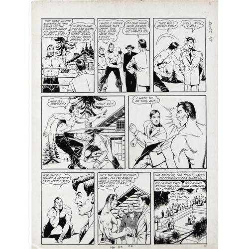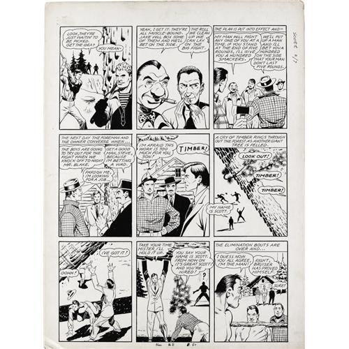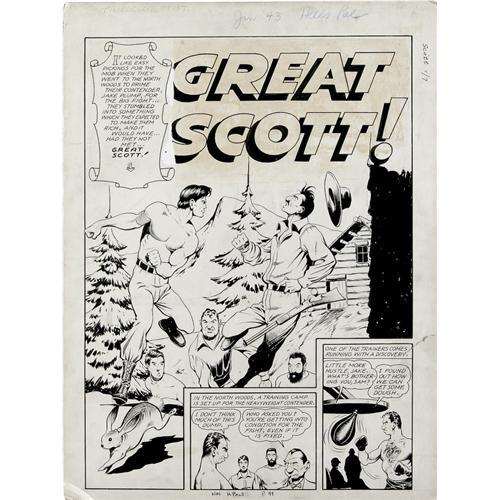 <B>George Tuska (attributed) - Hello Pal #3 Complete 7-page Story "Great Scott" Original Art (Harvey, 1943).</B></I> There's plenty of slam-bang action in this Golden Age romp. The image area of each illustration board measures approximately 13" x 18", and aside from aging to the boards and a missing title logo stat on page one, the art is in Good condition. <BR><BR><B>Important notice:</B> Heritage usually auctions material at the rate of 200-250 lots per hour. On some occasions eBay Live bid software or the Internet may not be able to keep up with the pace of the auction. We recommend placing a realistic absentee bid now as insurance to avoid disappointment. Occasionally the auctioneer may eliminate or reject an eBay Live bid, and the auctioneer may also reopen a lot after the close of the eBay live bidding (usually because we missed an audience bid), and may reject your bid even if it shows you as the winning bidder. By bidding via eBay Live, you agree that Heritage may award the lot to another bidder at its sole discretion under the circumstances described above or any other reasonable circumstances. Since eBay bids are not shown to us until we open the lot on the floor, we treat those bids just like floor bids. In most cases the floor responds before the eBay bid is presented to us, due to Internet lag time, so for consistency we have made it a policy that floor bids are always considered first over tie eBay live bids. Also please note that all Heritage lots purchased through eBay Live carry a 22.5% Buyer's Premium. Please make sure you read the Terms and Conditions before you bid. This lot is being auctioned in conjunction with a live floor auction by Heritage Auction Galleries. All final auction and invoice information will be supplied by Heritage Auction Galleries, and all other information should be considered preliminary. Lot:41001 <BR><BR><B>Winning Notification and Billing:</B> After the FINAL session in this auction is complete, Heritage will send e-mail and snail mail invoices. This process normally takes several days. All final auction and invoice information will be supplied by Heritage Auction Galleries, and all other information should be considered preliminary. <BR><BR>This auction will be conducted on a live auction floor and over the Internet through eBay Live. If you choose to place an absentee bid, please take a moment to <font color='#0000ff'><u><a href='http://pages.ebay.com/liveauctions/help/before/laabsentee.html'>learn how eBay Live absentee bidding works</a></u></font><font color='#000000'>