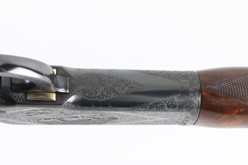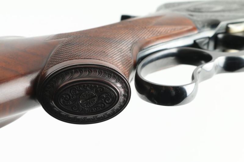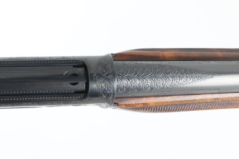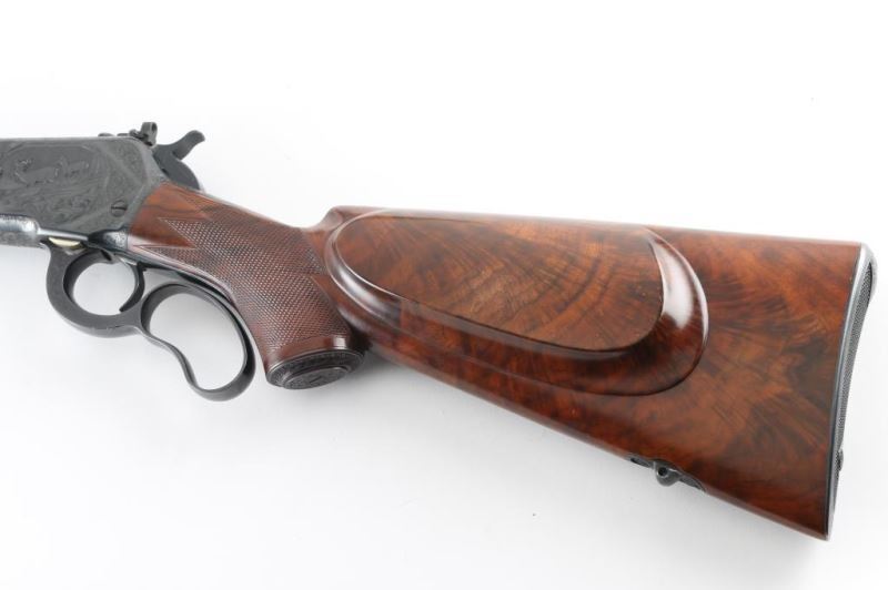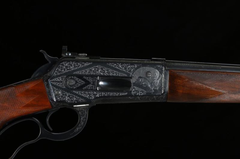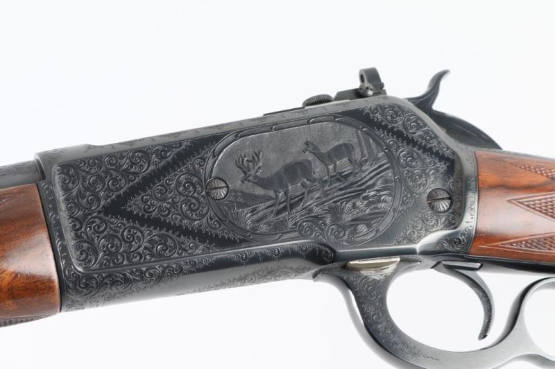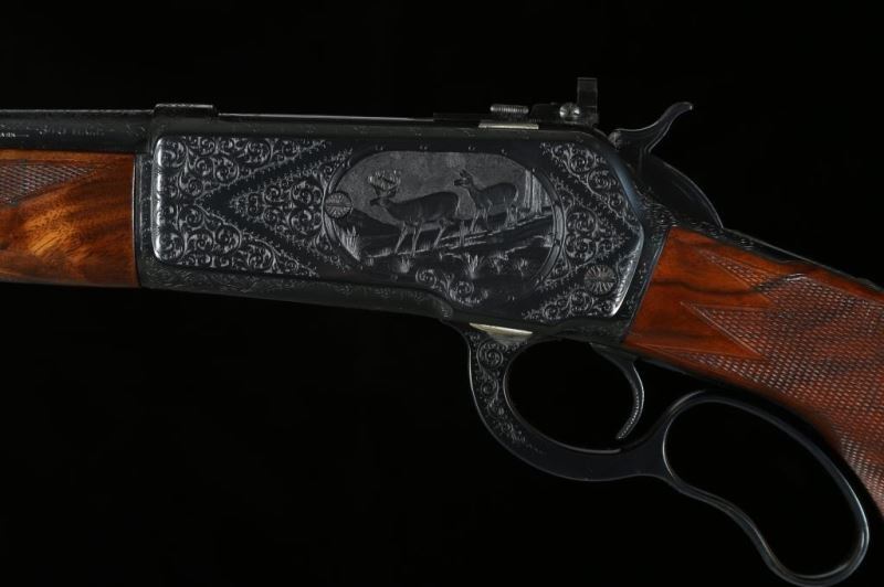Model 71 Deluxe .348 Win SN: 2123 Extraordinary factory engraved lever action repeating rifle chambered in .348 Winchester. Manufactured circa 1936 with the engraving executed by factory master engraver Alden George Ulrich, the last member of the Ulrich engraving dynasty, in 1941. Includes a factory letter that reads "Ordered: November 12, 1941/ For: Abercrombie and Fitch Company of New York, Consignment/ Ordered as:/ Symbol: G7100C/ Grade: Custom built/ Caliber: .348 Winchester/ Barrel Type: Round/ Barrel Length: 24 inches/ Fancy, Checkered stock and forearm/ Engraved/ Cheek Piece/ Metal butt plate, Engraved/ Peep sight/ Use gun #2123/ To Pack: November 22, 1941". Fine Germanic scroll engraving is found on nearly all of the major metal parts with ribboned scroll & game scenes on the receiver flats; to include a relief buck & doe mule deer in woodland scene on the left side and relief mountain lion perched on a tree branch on the right. Configuration: blued finish, 24" round barrel, 2/3 length magazine tube, ramped & hooded blade front sight with bead top, blank inserted into the rear sight dovetail, adjustable peep sight mounted on the bolt, knurled trigger, knurled hammer spur, curved finger lever, point checkered extra fancy walnut semi-beavertail forend, steel forend cap with dovetailed sling swivel stud, and pistol grip shoulder stock with beaded right handed cheekpiece, inletted sling swivel stud, engraved steel grip cap & knurled steel buttplate. Also includes a letter from Pauline Muerrle, Winchester Factory Engraver, Author & Historian, that states "This gun was engraved by Winchester factory engraver, George Ulrich. It is an excellent example of his work and one of the nicest factory engraved Model 71s that I have seen." Rifle exhibits approximately 99% of it's original blued finish showing very little wear and a minute amount of pin prick pitting on the top/right side of the barrel approximately 9.5" from the muzzle. Action is smooth, the bore is excellent, markings are clear and the near exhibition grade wood stocks are near fine with light finish loss & a few small blemishes. With factory letter. A magnificent rifle to behold! Condition is near NRA Excellent. ***C&R Firearm*** [From the Jim Sigmon Collection, Formerly in the Jim Wilkinson, Rifle Ranch Collection]