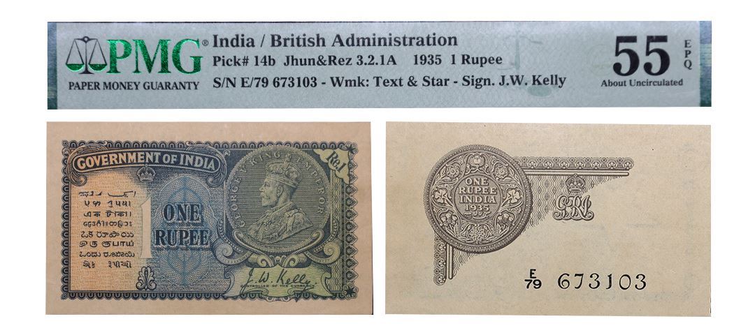 George V, 1 rupee, 2nd issue, 1935, signed by J.W. Kelly, serial no.: E79 673103, J&R 3.2.1A. PMG graded 55 About Uncirculated, Exceptional Paper Quality, Very rare.