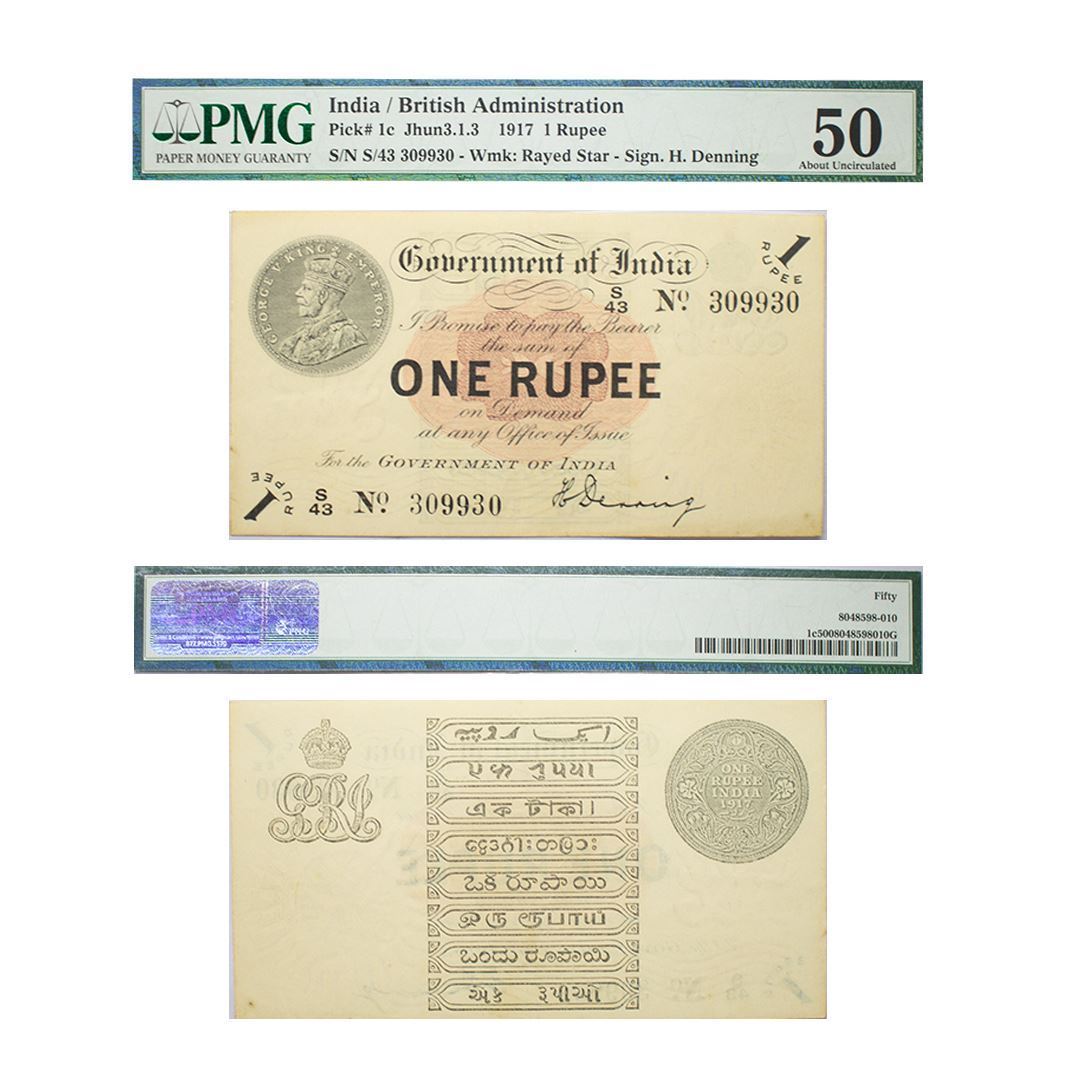 George V, 1 rupee, Universalized circle, 1917, signed by H. Denning, serial no.: S43 309930, watermark 'Rayed Star', correct Gujarati, printed in England, J&R 3.1.3, Graded as 50 Almost UNC by PMG, Very rare.