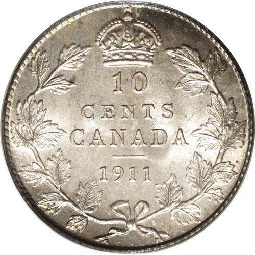 <B>George V 10 Cents 1911, </B></I>KM17, MS67 PCGS, meticulously sharp details with full mint brilliance and attractive light gold and gray patina. Tied for the finest known and two points better than the Belzberg example.<BR><I>From the Dominion Collection.</B></I>
