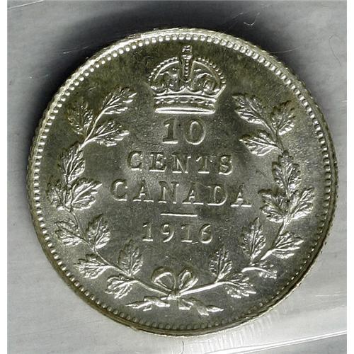 <B>George V 10 Cents 1916, </B></I>KM23, MS63 ICCS, frosty white mint luster with just a few light contact marks in the obverse fields.<BR><I>From the Dominion Collection.</B></I>