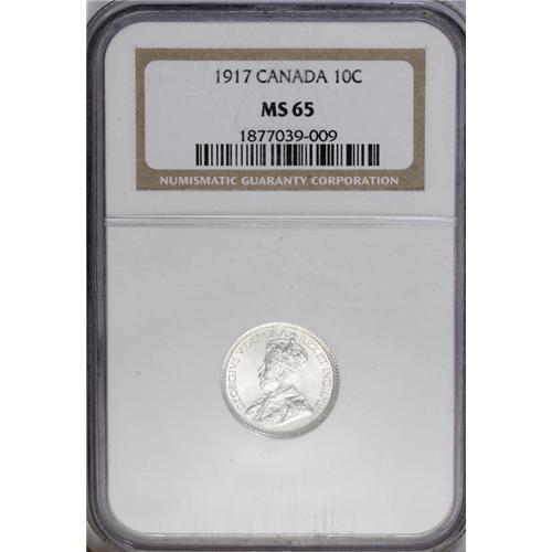<B>George V 10 Cents 1917, </B></I>KM23, MS65 NGC, meticulously sharp design details and glowing mint luster, a superb type coin.