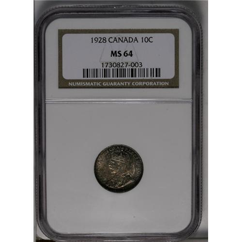 George V 10 Cents 1928, KM23a, MS64 NGC, deeply toned w