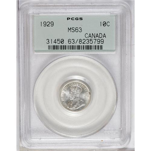 <B>George V 10 Cents 1929, </B></I>KM23a, MS63 PCGS, fully brilliant and well struck.