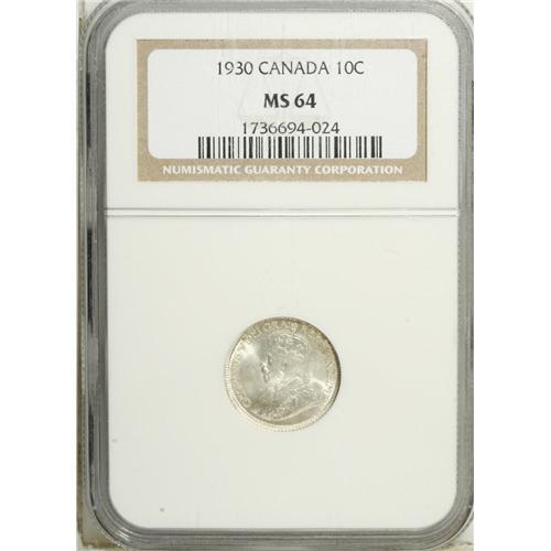 <B>George V 10 Cents 1930, </B></I>KM23a, MS64 NGC, fully brilliant with frosty white mint luster.<BR><BR><b>Shipping:</b> Coin/Currency (<a target="_blank" href="http://www.heritageauctions.com/common/shipping.php">view shipping information</a>)