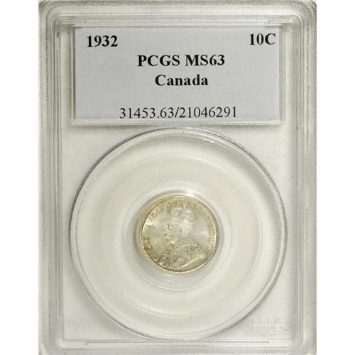 <B>George V 10 Cents 1932, </B></I>KM23a, MS63 PCGS, a nice original coin with attractive gold and gray patina. Scarce date in this grade.<BR><BR><b>Shipping:</b> Coin/Currency (<a target="_blank" href="http://www.heritageauctions.com/common/shipping.php">view shipping information</a>)