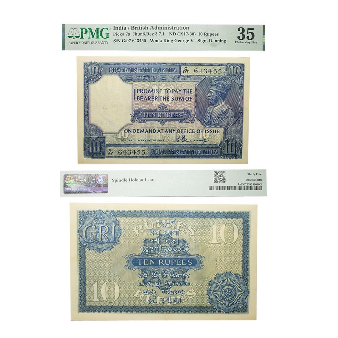 George V, 10 rupees, 1st issue, ND (1923), signed by H. Denning, serial no.: J40 643455, printed in England, J&R 3.7.1, spindle hole, PMG graded Choice Very fine 35, Rare.