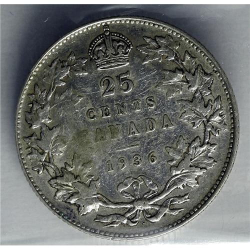 <B>George V 25 Cents 1936 Dot with Bar,</B></I> KM24a, Fine15 ICCS. A very scarce combination with both varieties present.<BR><I>From the Dominion Collection.</B></I>