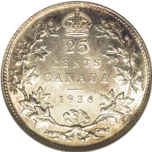 <B>George V 25 Cents 1936,</B></I> KM24a, MS64 NGC. Lightly abraded and well struck with golden toning and a few charcoal splashes on the obverse.