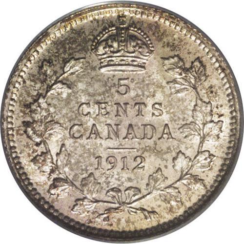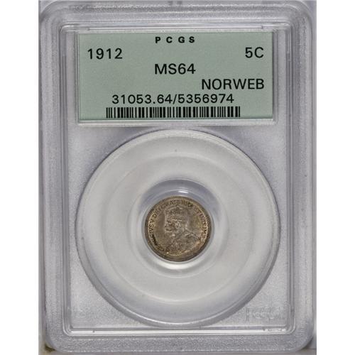 <B>George V 5 Cents 1912,</B></I> Ex: Norweb Collection, KM22, MS64 PCGS. Gray, gold, and russet patina with a few contact marks on the obverse.<BR><I>From the Dominion Collection.</B></I>