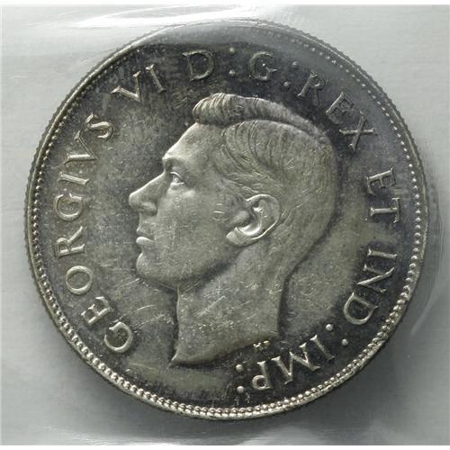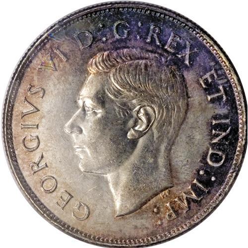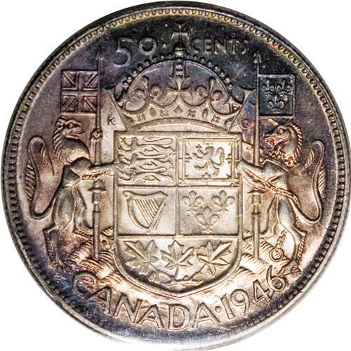 <B>George VI 50 Cents 1946 Design in 6,</B></I> KM36, MS60 ICCS. Moderately abraded and lustrous with gold and steel-blue toning. A very scarce issue in Mint State with only two pieces certified finer by ICCS.<BR><I>From the Dominion Collection.</B></I>