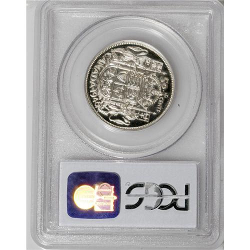 <B>George VI 50 Cents 1946,</B></I> Ex: Pittman, Belzberg Collections, KM36, Specimen 64 PCGS. A beautiful white cameo with superb definition. There are two small spots near the obverse rim, above the GEOR of GEORGIVS, where the mint lacquering is slightly discolored. A medium rarity in terms of George VI Specimen 50 Cents. A coin that definitely appears nicer than the stated grade.<BR><I>From the Wellington Collection..</B></I>