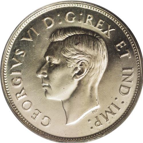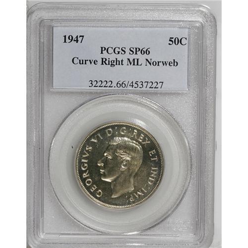 <B>George VI 50 Cents 1947 Maple Leaf Curved 7,</B></I> Ex: Norweb Collection, KM36, Specimen 66 PCGS. Superbly struck with fully mirrored fields and light golden toning. This issue was struck in 1948 and issued in the Maple Leaf Specimen sets. The obverse dies were later used to strike the concave version of the 1948 Specimen 50 Cent. Only one piece has been certified finer by PCGS.<BR><I>From the Dominion Collection.</B></I>