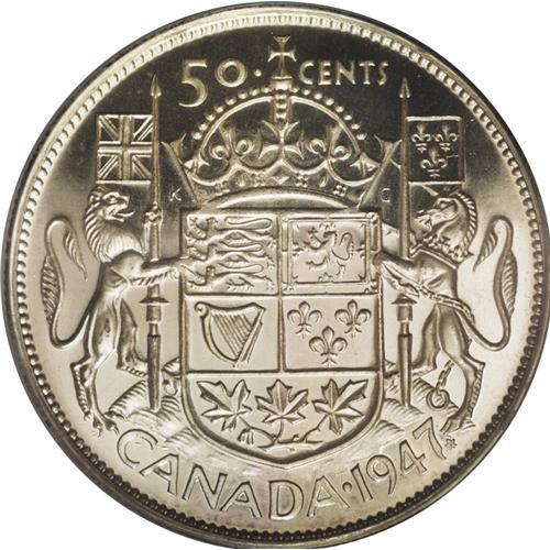 George V 50 Cents 1947 Maple Leaf Curved 7, Ex: Norweb