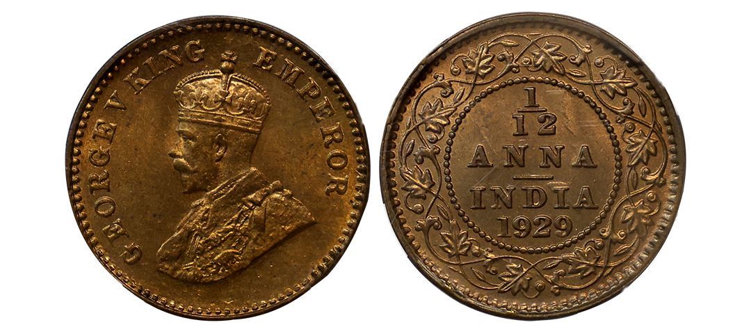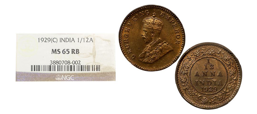 George V, Bronze 1/12 anna,1929, Calcutta Mint, (Prid 859). Graded by NGC MS65RB.