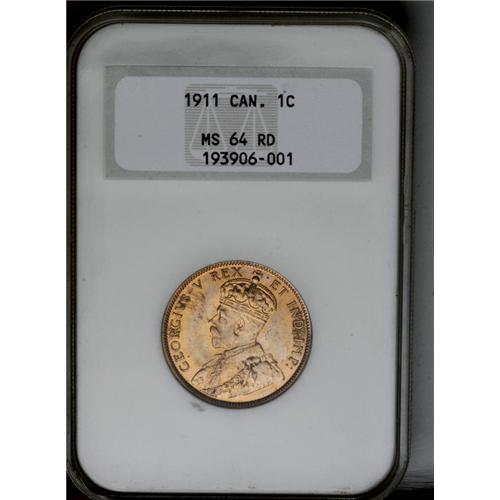 <B>George V Cent 1911, </B></I>KM15, MS64 RD NGC, very bright luster with a superb reverse.