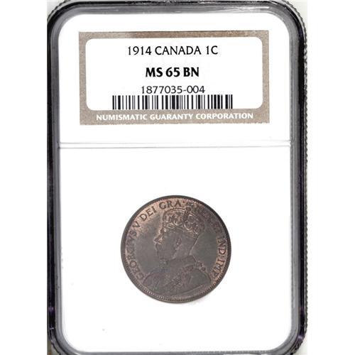 <B>George V Cent 1914,</B></I> KM21, MS65 Brown NGC. Sharply struck with considerable remaining luster. One wonders how this does not qualify for Red and Brown designation.