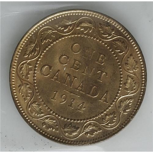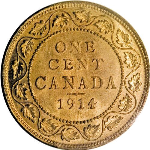 <B>George V Cent 1914, </B></I>KM21, MS65 ICCS, not noted by ICCS as Red (or anything else) but with full original mint brilliance and great eye appeal. Rare in this desirable quality and nicer than the Belzberg examples which were graded MS64 RB and 64 RD.<BR><I>From the Dominion Collection.</B></I>