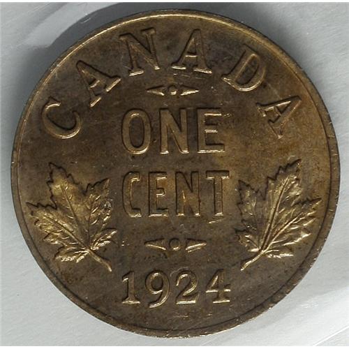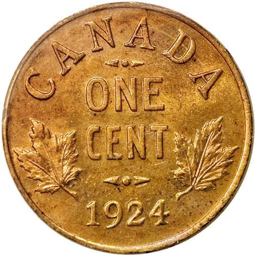 <B>George V Cent 1924, </B></I>KM28, MS64 RED ICCS, a remarkably choice example of this scarce date with full brilliant mint luster.<BR><I>From the Dominion Collection.</B></I>
