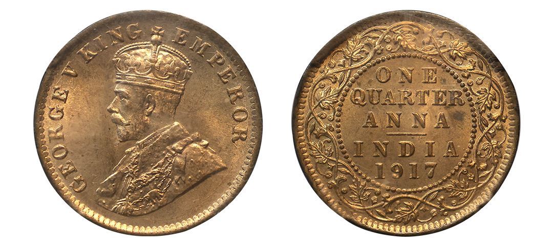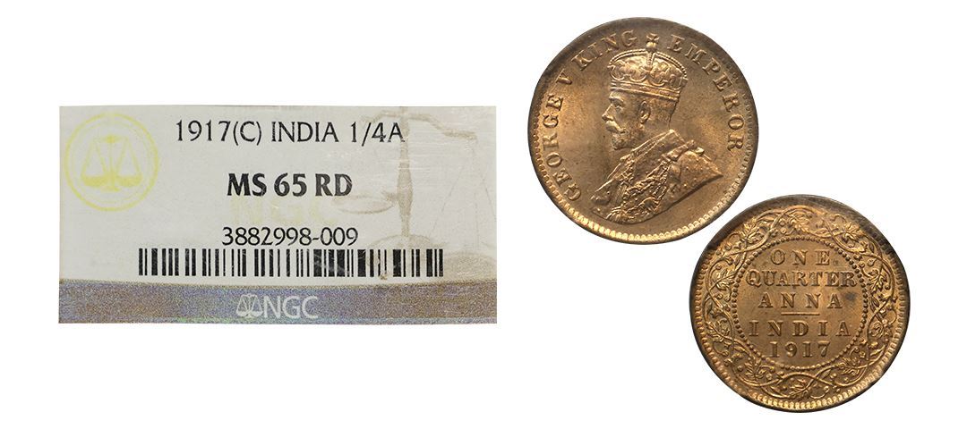 George V, Copper ¼ Anna, 1917, Calcutta Mint.(KM 512) Graded by NGC MS65 RD.