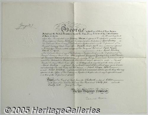 <B>George V Document Signed as King</B></I> Partly-printed document signed "George R" as King of Great Britain, 21.1" x 16.25", Court of St. James, October 13, 1935 appointing Frank Keynon Roberts as Second Secretary, "in Our Diplomatic Service at any of Our Embassies Legations abroad or in the Department of Our Principal Secretary of State for Foreign Affairs..." Vertical and horizontal creases, otherwise very bright and clean with a bold signature. <I>Accompanied by COA from PSA/DNA.</B></I>
