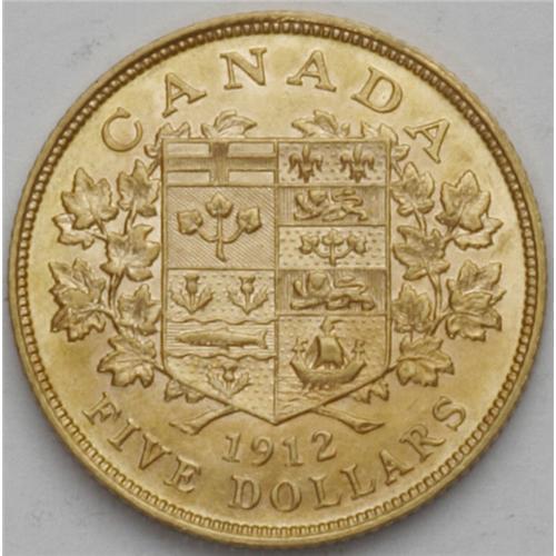 <B>George V gold Five Dollars 1912</B></I> KM20, XF, with the typical contact marks for gold.