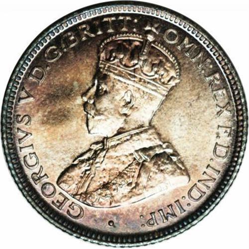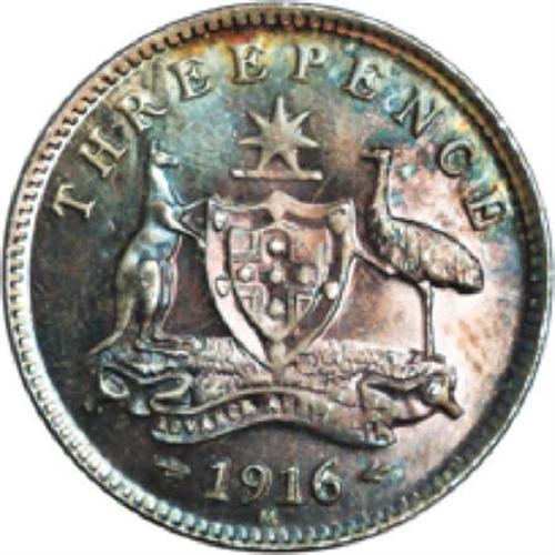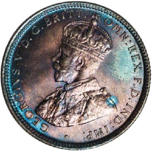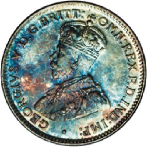 <B>George V Four-piece 1916M Specimen Set in the Original Case consisting of:</B></I> Threepence, KM24; Sixpence, KM25; Shilling, KM26; and a Florin, KM27. Listed as a set as KM-PS3. The toning, from being housed in the original case, is absolutely spectacular. Each coin is fully lustrous beneath stunning cobalt-blue, steel-gray, purple, and gold toning. Unfortunately, on close examination the threepence and sixpence have minor marks from previous mishandling.