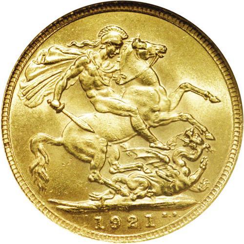 <B>George V Gold Sovereign 1921S,</B></I> KM29, MS64 NGC. Fully lustrous with a greenish-gold patina.