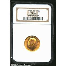 George V Gold Sovereign 1925, MS66 NGC. Really a superb Sovereign in this quality. Important notice: We expect to be auctioning lots at the rate of 200-250 per hour. Sometimes eBay Premier live bid software cannot keep up with that pace, so we strongly recommend that you place a realistic proxy bid now as insurance to avoid disappointment. Also please note that all Heritage/CAA lots purchased through eBay Premier carry a 20% Buyer's Premium. Please make sure you read the Terms and Conditions.