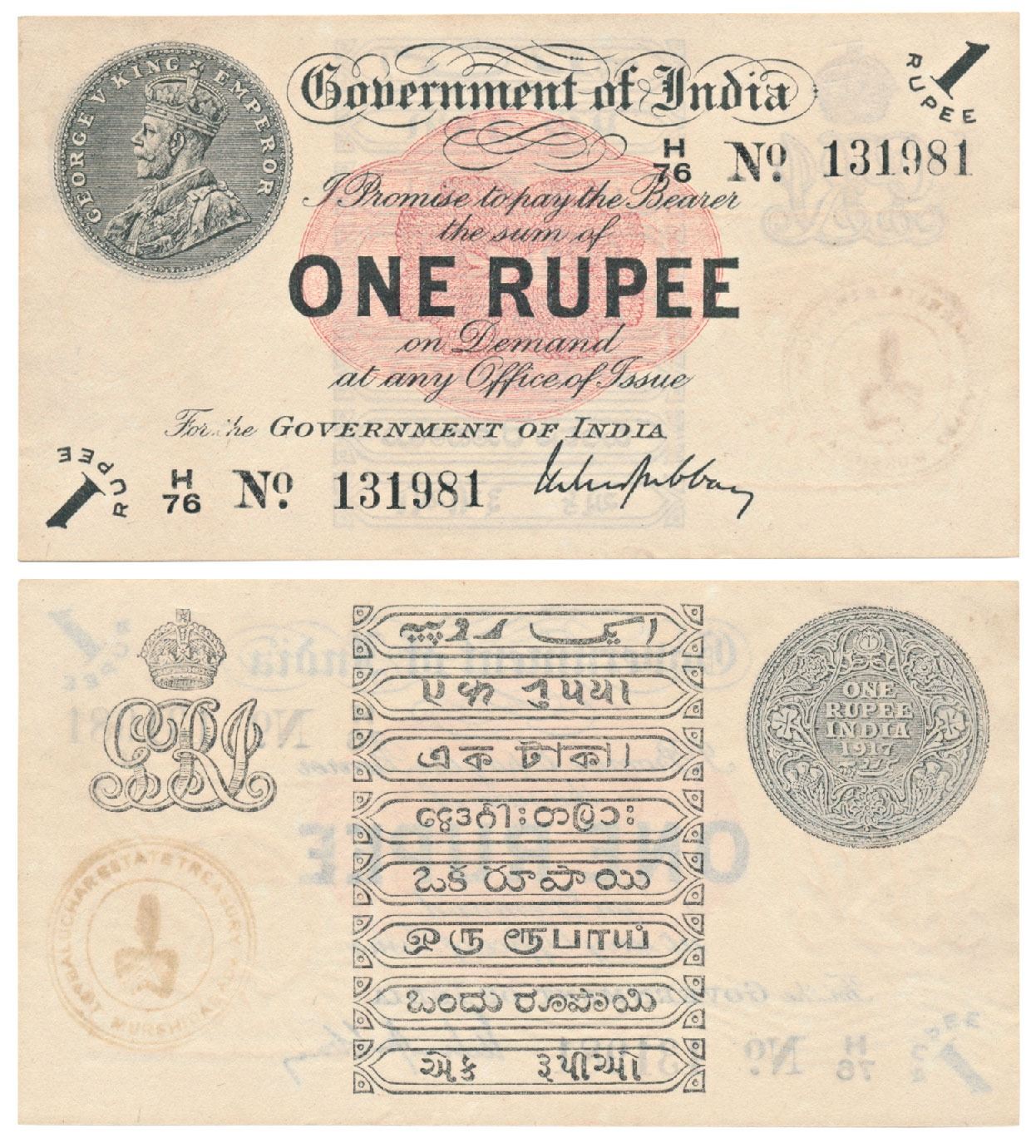George V, Rupee 1, 1st issue, 1917, signed M. M. S. Gubbay (J&R 3.1.1B). Light rubber stamp, on reverse, About Uncirculated, Scarce.