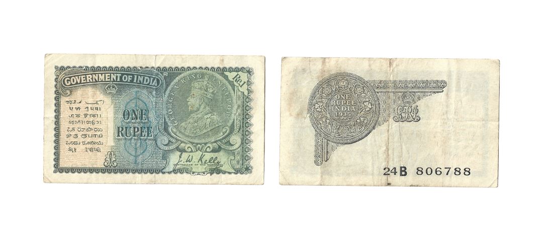George V, Rupee 1, 2nd issue, 1935, signed J. W. Kelly, Prefix B, Serial number : 24B 806788