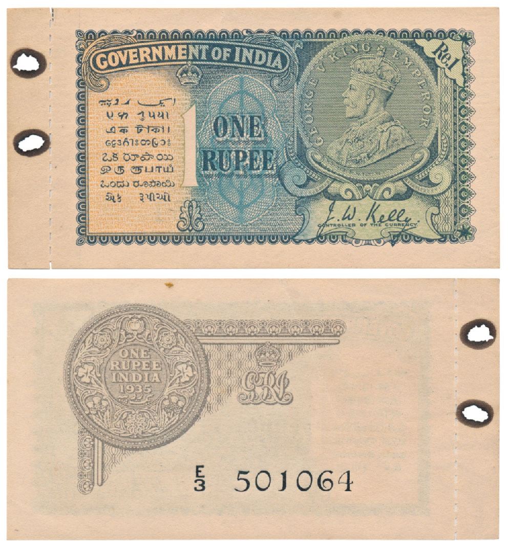 George V, Rupee 1, 2nd issue, 1935, signed J. W. Kelly, Prefix E, (J&R3.2.1A). With perforation margin of the booklet to left, Uncirculated, Rare.