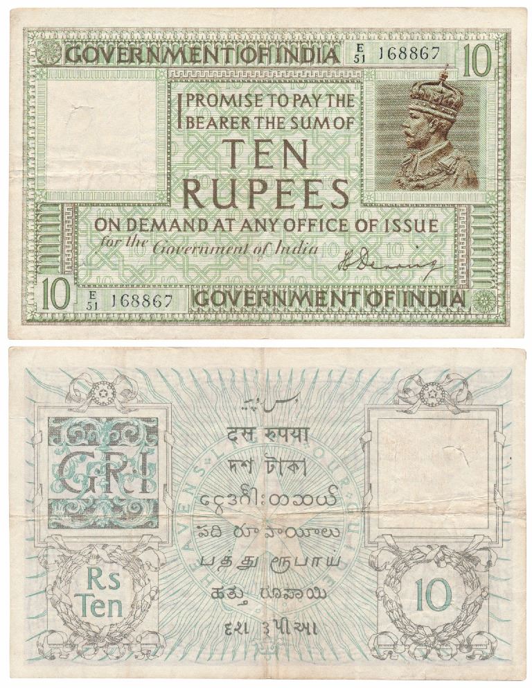 George V, Rupees 10, 1st issue, 1925, signed H. Denning, serial number in top right and bottom left corner (J&R 3.6A.1). Very Fine+, Rare.