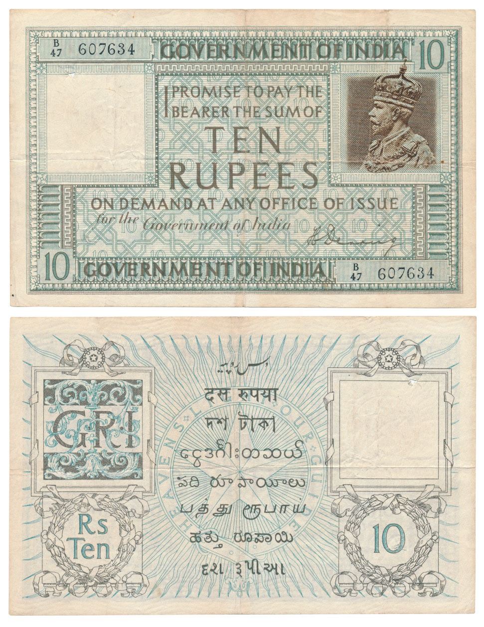 George V, Rupees 10, 1st issue, 1925, signed H. Denning, serial number in top left corner (J&R 3.6.2). Very Fine+, Rare.