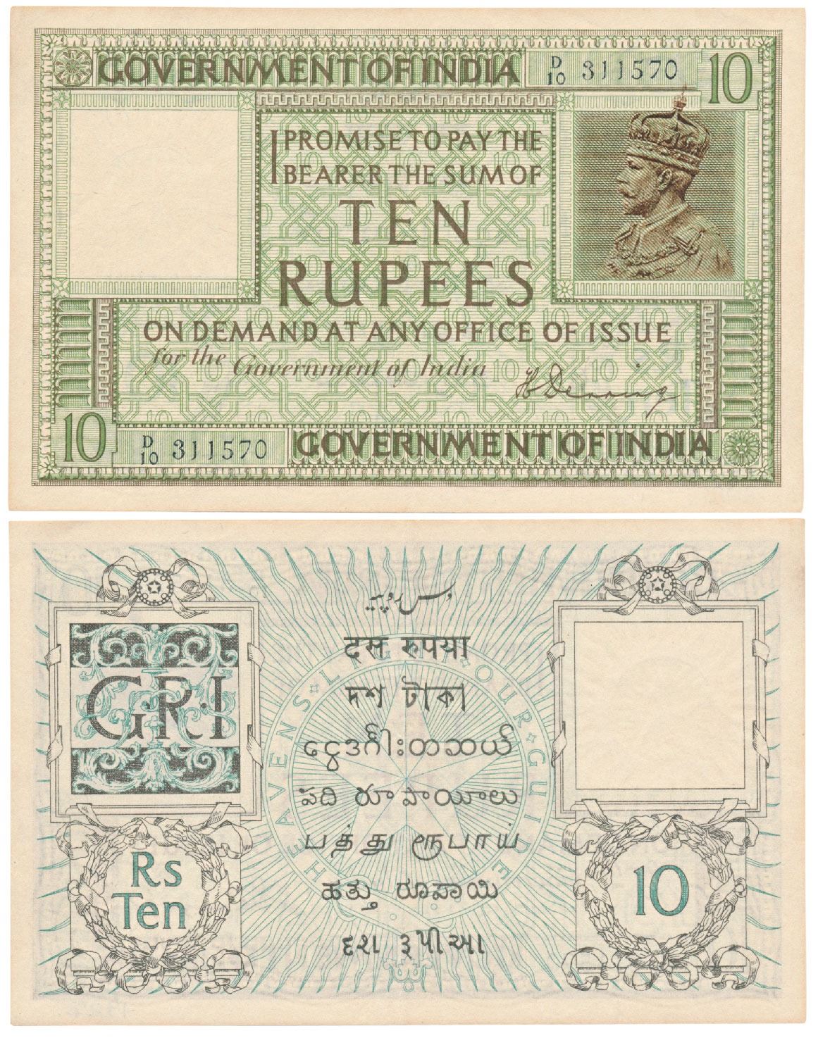 George V, Rupees 10, 1st issue, 1925, signed H. Denning, serial number in top right corner (J&R 3.6A.1). Uncirculated, Rare.