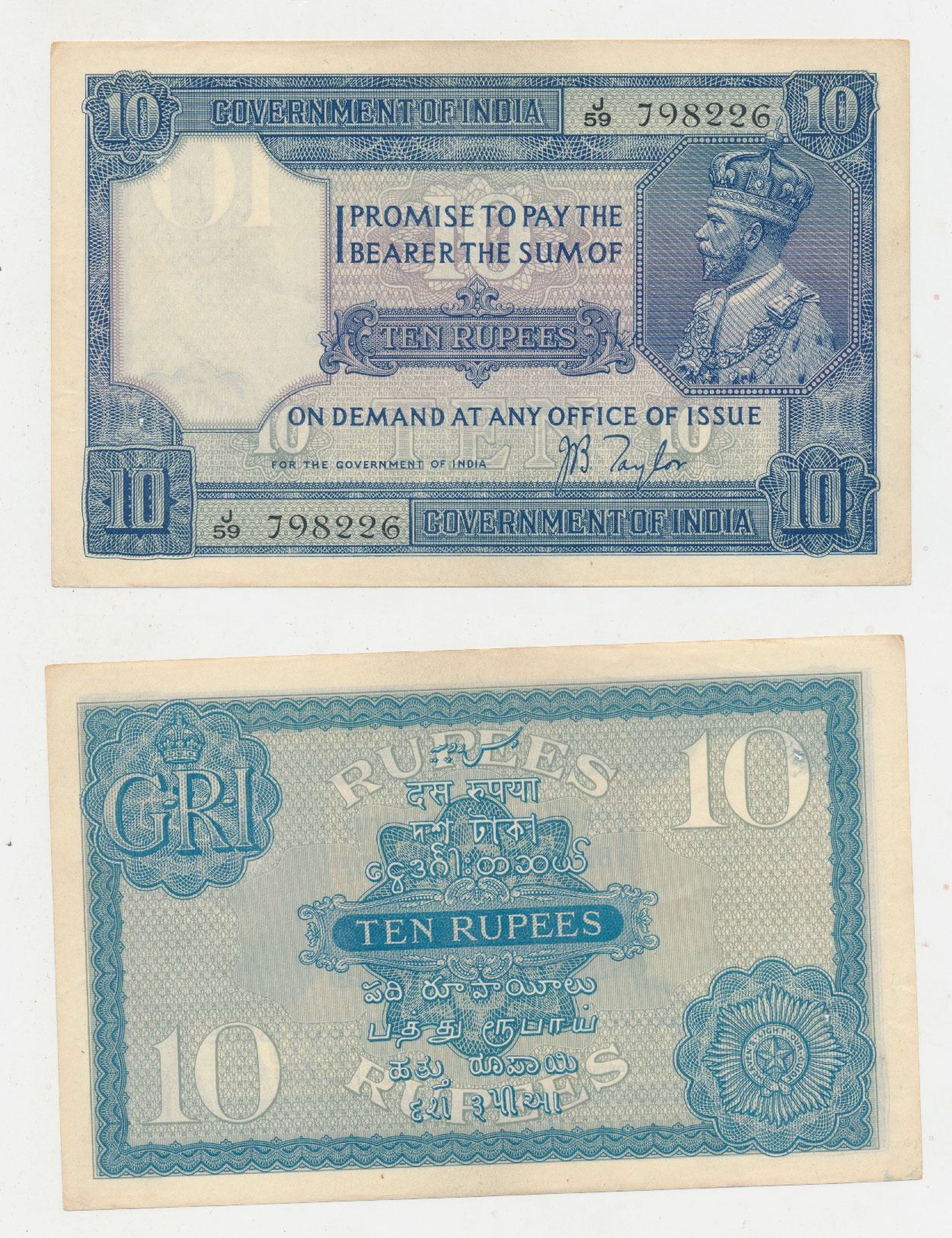 George V, Rupees 10, 2nd issue, 1926, signed J. B. Taylor, (J&R 3.7.2). About Uncirculated, Rare.