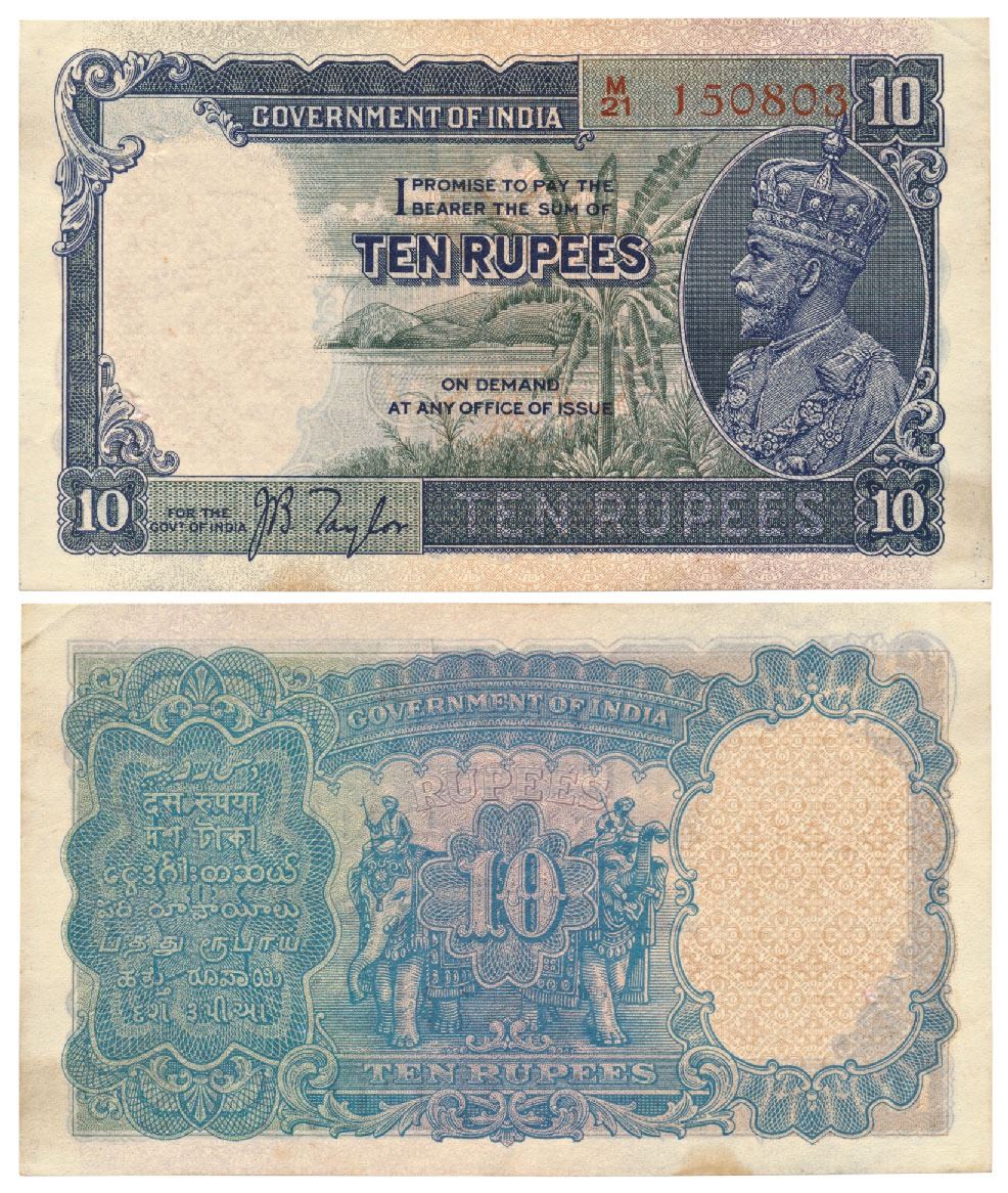 George V, Rupees 10, 3rd issue, 1933, signed J.B. Taylor, thin paper variety, (J&R 3.8.1A). Slight staining at the bottom still Extremely Fine.