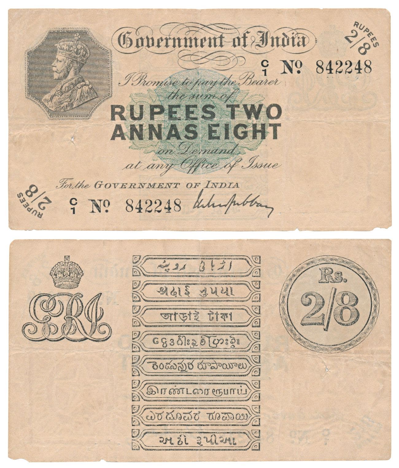 George V, Rupees 2 Annas 8 (2 & ½ Rupees), 1918, signed M. M. S. Gubbay, Prefix C for Calcutta, (J&R 3.3.1C). Very Fine+, Extremely Rare and the most sort after banknote in Indian Paper money.