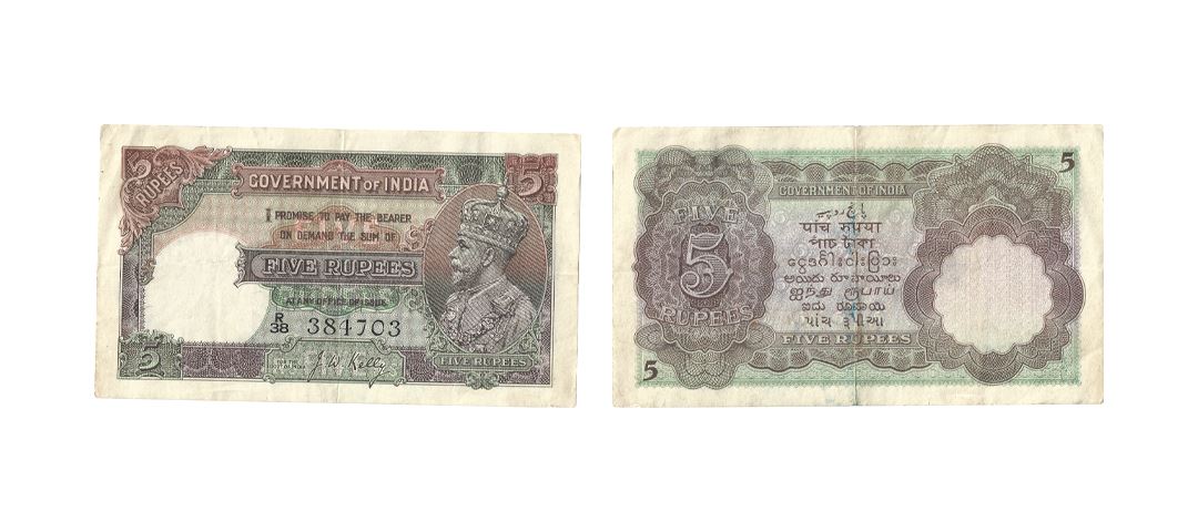 George V, Rupees 5, 1934, signed J. W. Kelly,Serial number : R38 384703