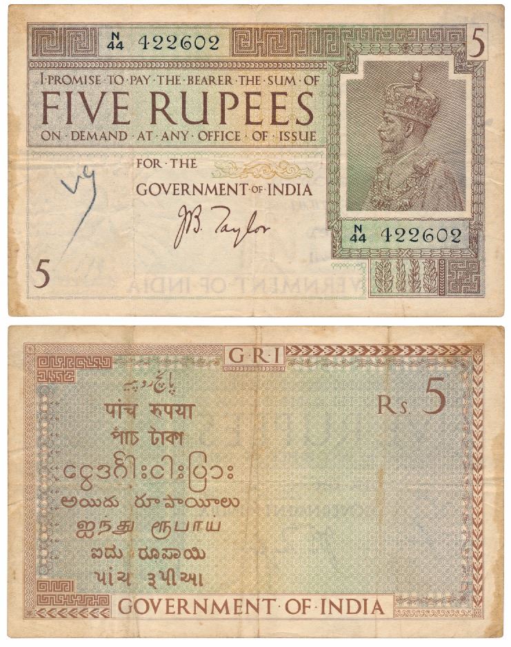 George V, Rupees 5, 1st issue, 1925, signed J. B. Taylor, (J&R 3.4.2). Very Fine+.