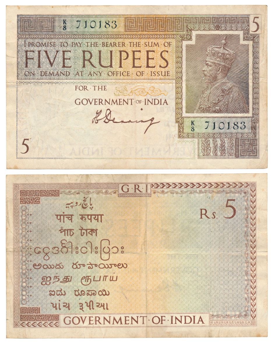 George V, Rupees 5, 1st issue, 1925, signed H. Denning, water mark variety A that is Govt of India within wavy lines (J&R 3.4.1A). Very Fine+, Rare.